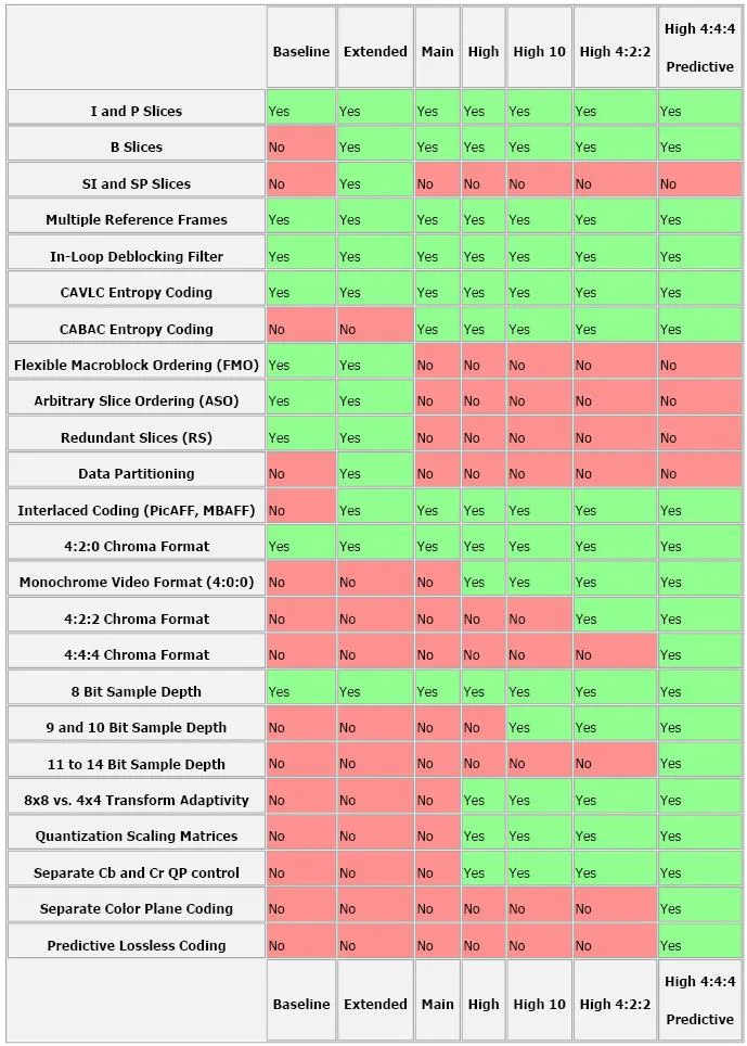 H.264 Baseline profile、Extended profile和Main profile都是针对8位样本数据、4:2:0格式(YUV)的视频序列。在相同配置情况下,High profile(HP)可以比Main profile(MP)降低10%的码率。 根据应用领域的不同,Baseline profile多应用于实时通信领域,Main profile多应用于流媒体领域,High profile则多应用于广电和存储领域。