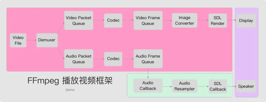 这个框架基本包含了播放器中所有基本要素,后续播放器音画同步、seek 等功能都基于此框架实现。