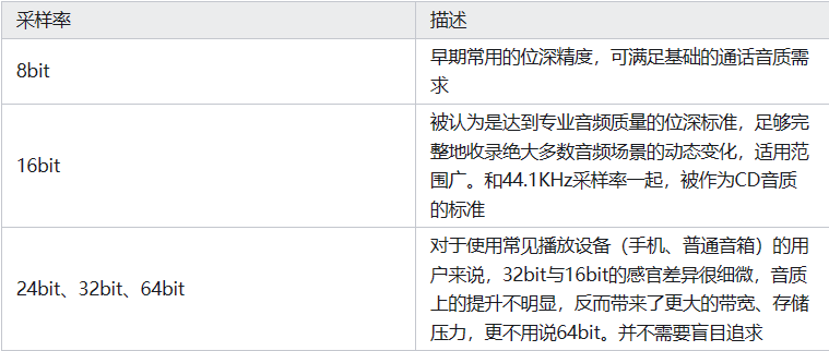 采样位深,指的是在音频采集量化过程中,每个采样点幅度值的取值精度,一般使用bit作为单位。比如,当采样位深为 8bit,则每个采样点的幅度值可以用 2^8=256 个量化值表示;采样位深为 16bit 时,则每个采样点的幅度值可以用 2^16=65536 个量化值表示